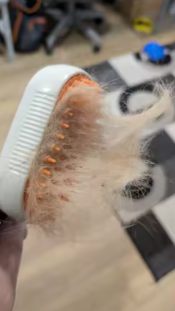 Das funktioniert wirklich. Meine Katze mag es, auch mit Dampf gebürstet zu werden. Ich war überrascht, wie gut es die Haare sammelt und dass sie tatsächlich in einem Stück entfernt werden